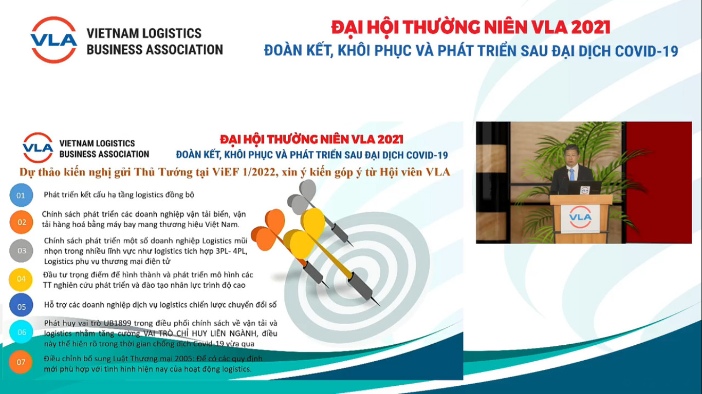Báo cáo tóm tắt, tổng kết hoạt động Hiệp hội VLA trong năm vừa qua, ông Nguyễn Duy Minh, Tổng Thư ký Hiệp hội VLA chia sẻ, trong năm 2021, VLA đã tích cực đẩy mạnh công tác phản biện xã hội nhằm kiến nghị những giải pháp, đề xuất hỗ trợ, tháo gỡ khó khăn cho doanh nghiệp ngành vận tải, logistics. Từ tháng 6/2021 – 9/2021, Hiệp hội đã soạn thảo và phát hành 40 văn bản gửi đến các cơ quan quản lý Nhà nước về các mặt công tác, đóng góp kịp thời cho hoạt động của ngành. Phát hành hơn 20 văn bản về các nội dung có liên quan đến hỗ trợ khó khăn, vướng mắt cho doanh nghiệp kinh doanh vận tải logistics trong bối cảnh dịch bệnh COVID-19.