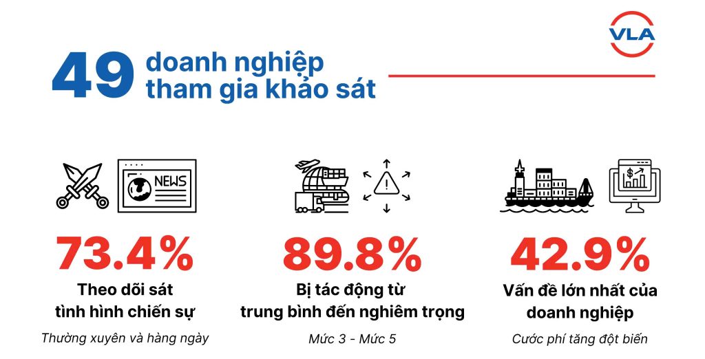 VLA vừa thực hiện một cuộc khảo sát mẫu với 49 doanh nghiệp logistics tại Việt Nam. Kết quả khảo sát cho thấy xung đột tại Trung Đông đang tạo ra áp lực đáng kể đối với chuỗi cung ứng và hoạt động vận tải quốc tế. Chi phí cước vận tải tăng đột biến, thời gian vận chuyển kéo dài và nguy cơ đơn hàng bị trì hoãn đang trở thành những thách thức lớn đối với cộng đồng doanh nghiệp.