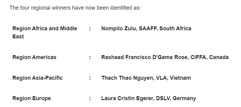 Được biết Cuộc thi “Young Logistics Professionals Award” được FIATA (International Federation of Freight Forwarders Associations) và Câu lạc bộ TT (International Transport and Logistics Insurance) tổ chức hàng năm nhằm mục đích tôn vinh và phát triển nhân tài trong lĩnh vực giao nhận, vận tải và logistics, phát triển hơn nữa tính chuyên nghiệp của những người trẻ trong ngành. Thí sinh từ các quốc gia trên thế giới sẽ được chia thành 4 khu vực dự thi gồm Châu Phi – Trung Đông, Châu Mỹ, Châu Á Thái Bình Dương và Châu Âu. Mỗi khu vực sẽ chọn ra một người chiến thắng để tham dự vòng chung kết tại Đại hội FIATA toàn cầu (FIATA World Congress).